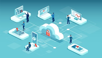 The Convergence of Security and Project Management » Vector of men and women using mobile devices and computers uploading data on secure cloud storage